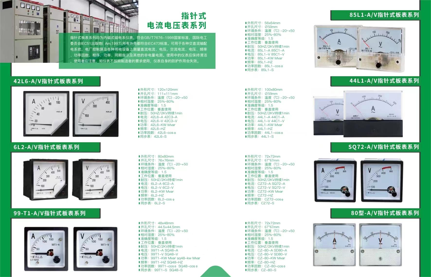 指针式板表系列均为内磁式磁电系仪表,符合GB/T7676-1998国家标准,国际电工委员会IEC51出版物(Am.1997),所有外壳都符合IEC473标准。可用于各种交直流输配电系统,电厂控制屏及各种用电设备上测量直流电流、电压,交流电流、电压、频率、功率因数、相序、功率、同期指示及其他的非电量电测。使用中的仪表应保持清洁使用者应注意,如仪表不按照制造者的要求使用,仪表自身的防护作用会失效。