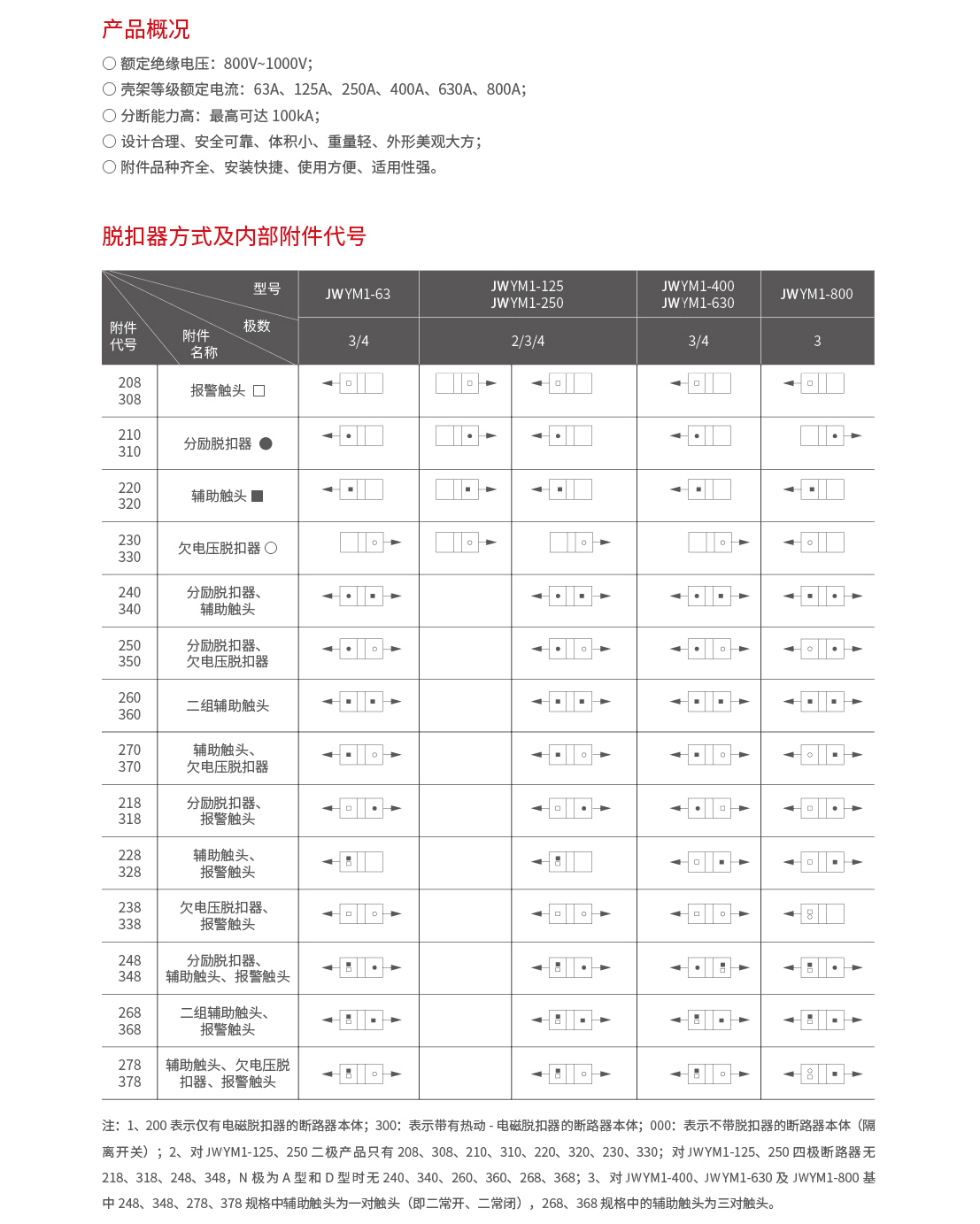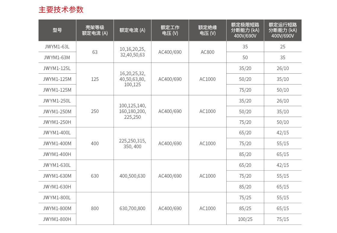 术进行研发和开发的新型断路器之一。其额定绝缘电压为1000V,其中630为800V,适用于交流50Hz,额定工作电压AC690V及以下,额定工作电流至800A的电路中作不频繁转换及电动机不频繁启动之用。断路器具有过载、短路和欠电压保护装置,能保护线路和电源设备免受损坏。