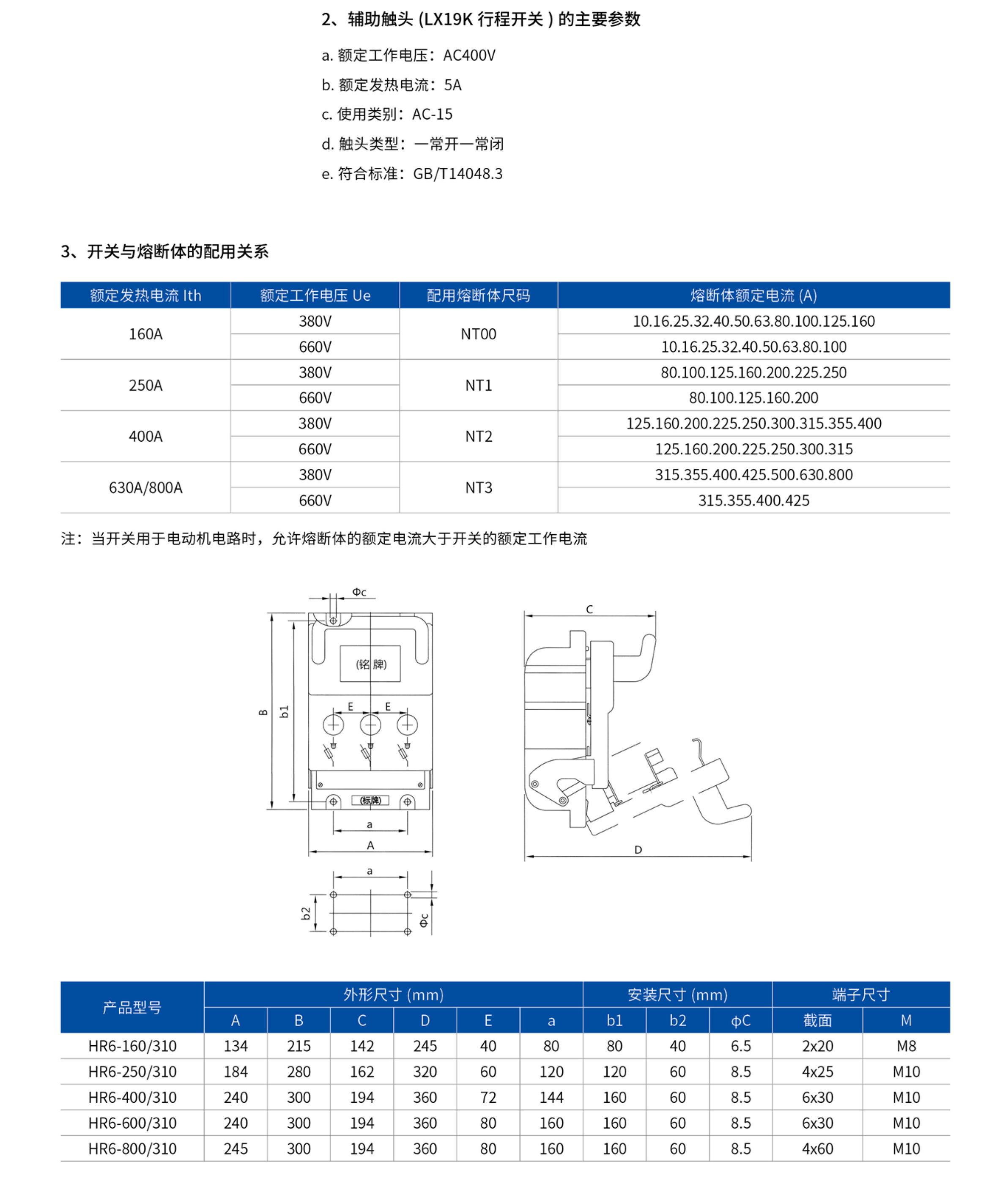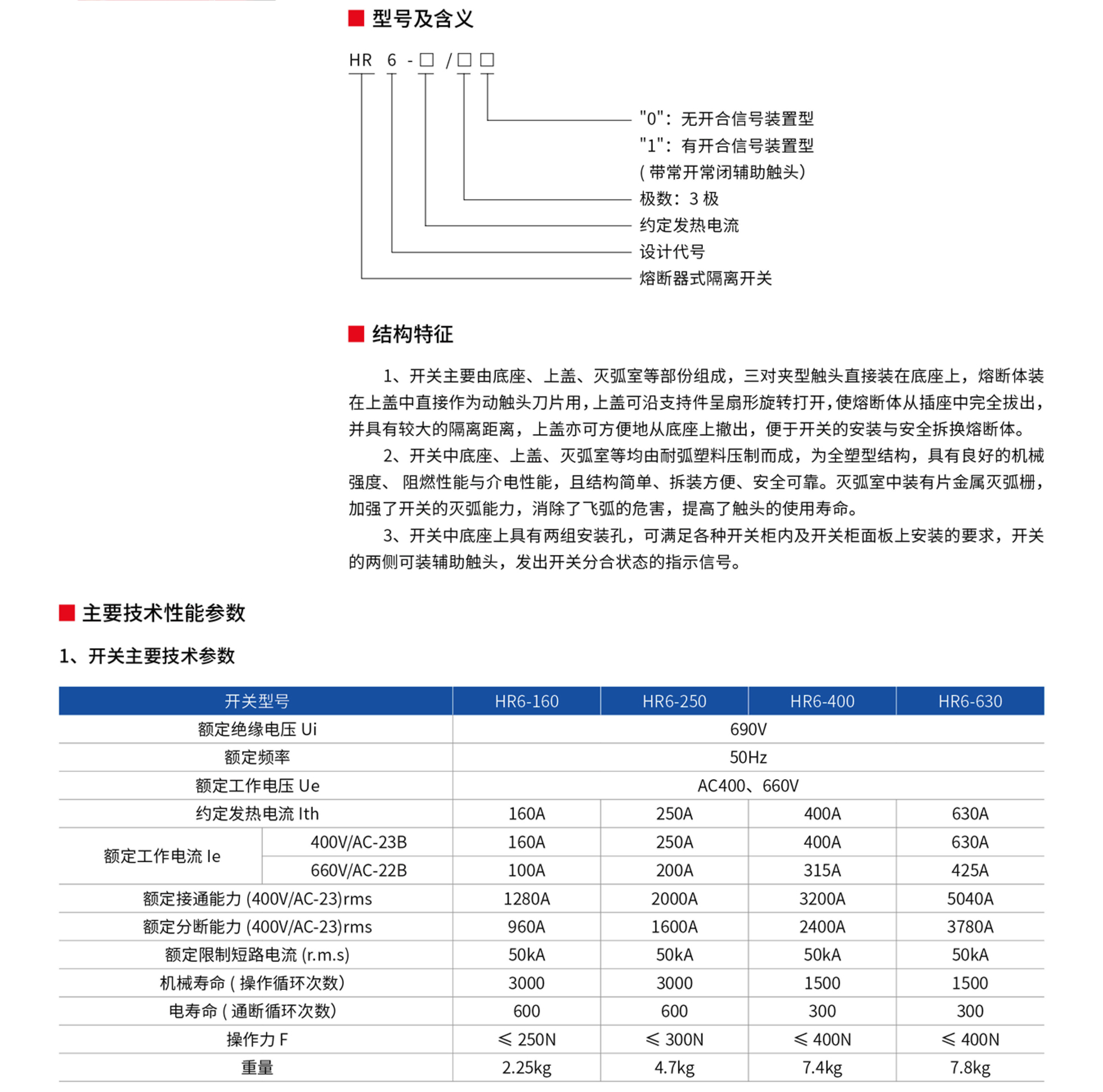 HR6系列熔断器式隔离开关(以下简称开关),是我公司参照德国AEG公司产品而设计的,适用于交流50Hz、额定电压至660V、约定发热电流至630A的具有高短路电流的配电电路和电动机电路中,用作手动不频繁操作的电源开关、隔离开关和应急开关,并作为电路短路保护之用,但一般不作为直接开闭单台电动机之用。开关结构简单、操作方便,符IEC60947-3GB/T14048.3标准,是同类产品的最佳选择。